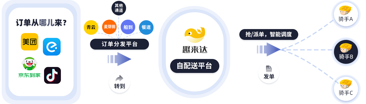 支持导入美团外卖、饿了么、抖音、京东到家等第三方平台订单,通过订单分发平台(青云、麦芽田、餐道)推送到自营平台的骑手端,由自营平台骑手进行抢单/派单并提供跑腿服务